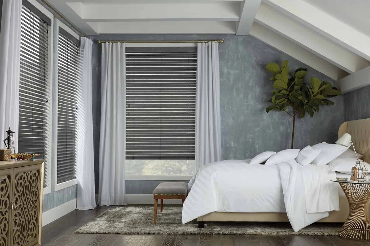 The line of Modern Precious Metals® Aluminum Blinds are a great way to add sophistication and style to your windows. Whether you are looking for the perfect window treatment for your office, or you want to make your home feel more luxurious, metallic finishes is a popular choice in the design world. This makes it an excellent option for customizing both residential and commercial projects, no matter what size or shape they may be. Its lightweight material can be finished into any texture imaginable from a matte look to pearlescent tones. They come in various finishes, so there's something suitable for every taste!